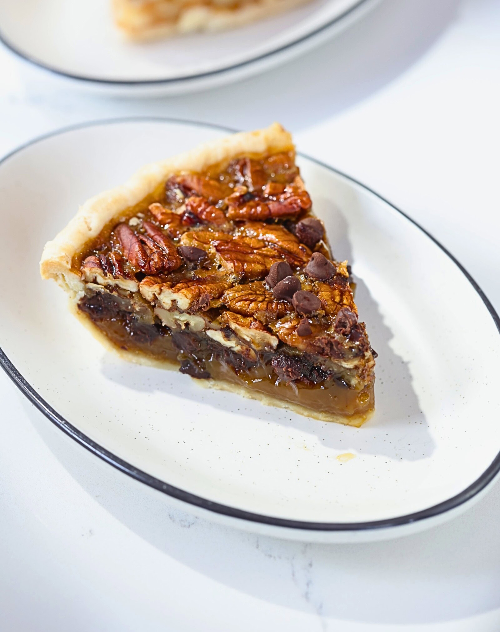 Whole Texas pecans in a rich dark butter custard with Ghirardelli chocolate pieces in an all butter crust