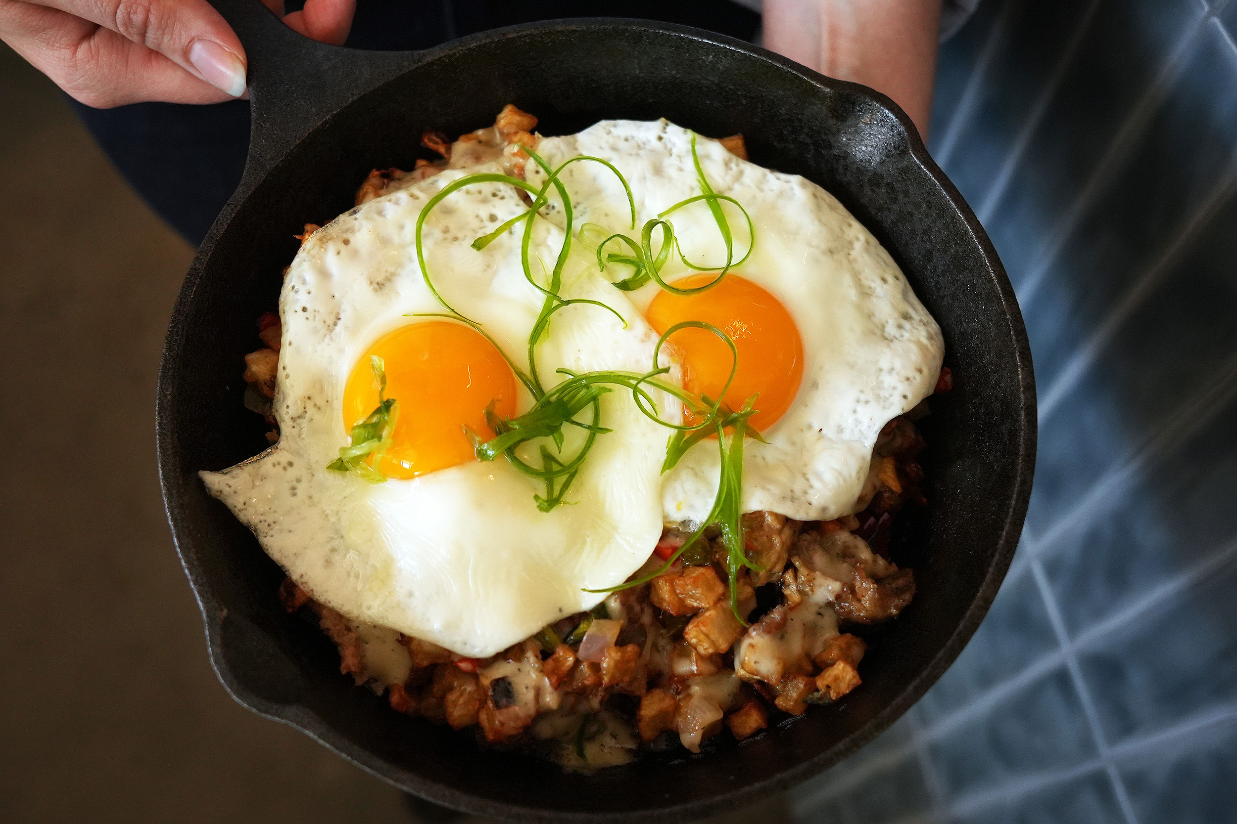 pork sausage, skillet potatoes, jalapeños, onions, peppers, scallions, white cheddar, gravy, sunny side vital farms egg