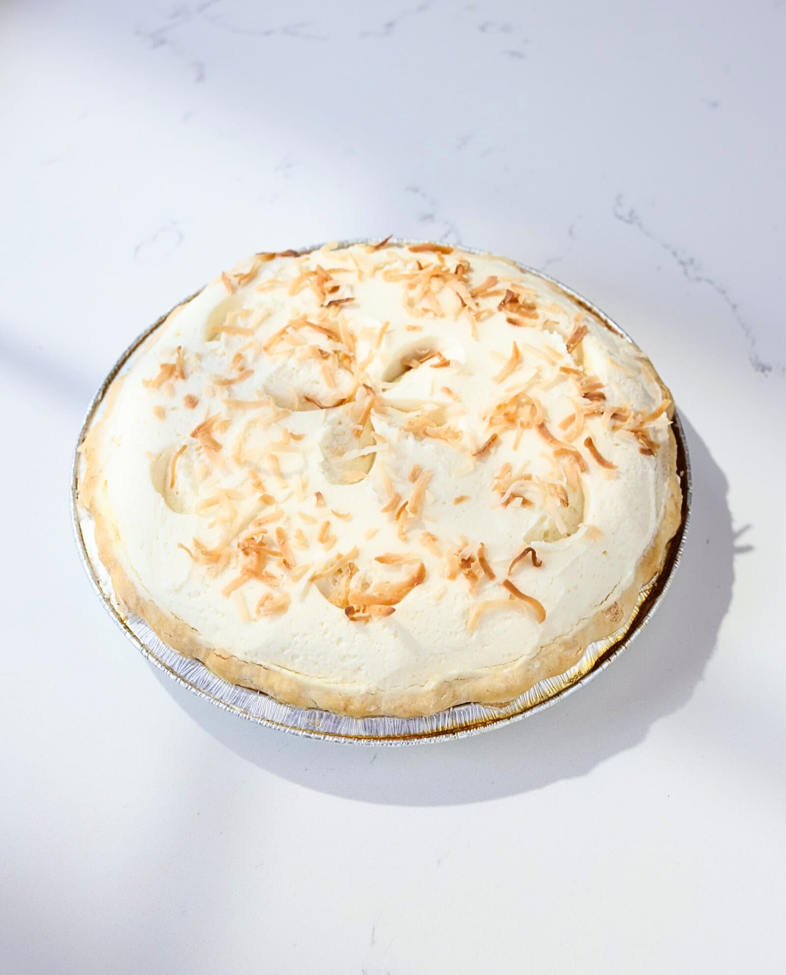 Rich white chocolate mousse flavored with toasted coconut and coconut milk served in our all butter bottom crust. Topped with slightly sweet real whipped cream and toasted coconut.