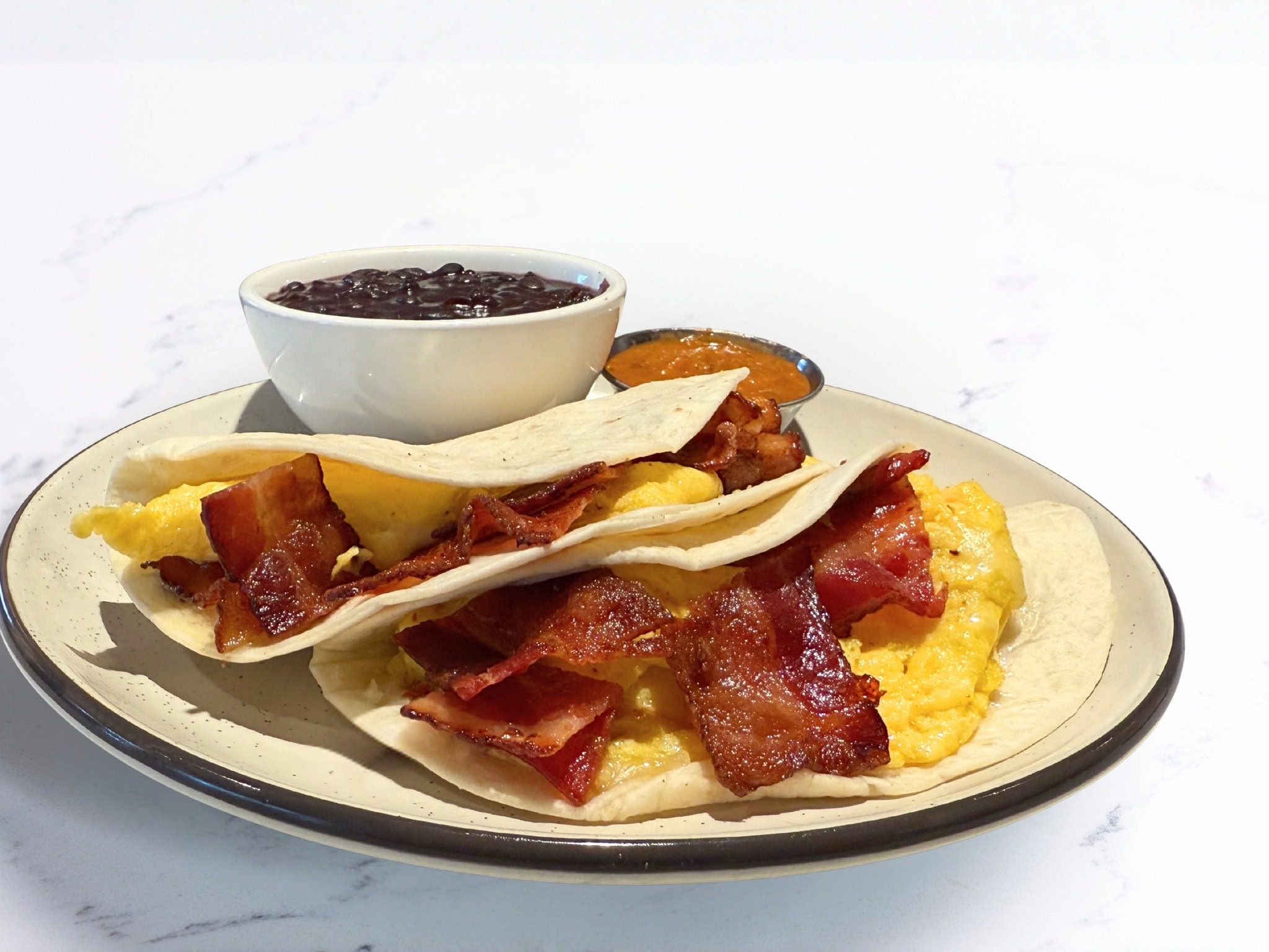 [gf] scrambled vital farms eggs, bacon, white cheddar, on flour or corn tortillas with a side of black beans