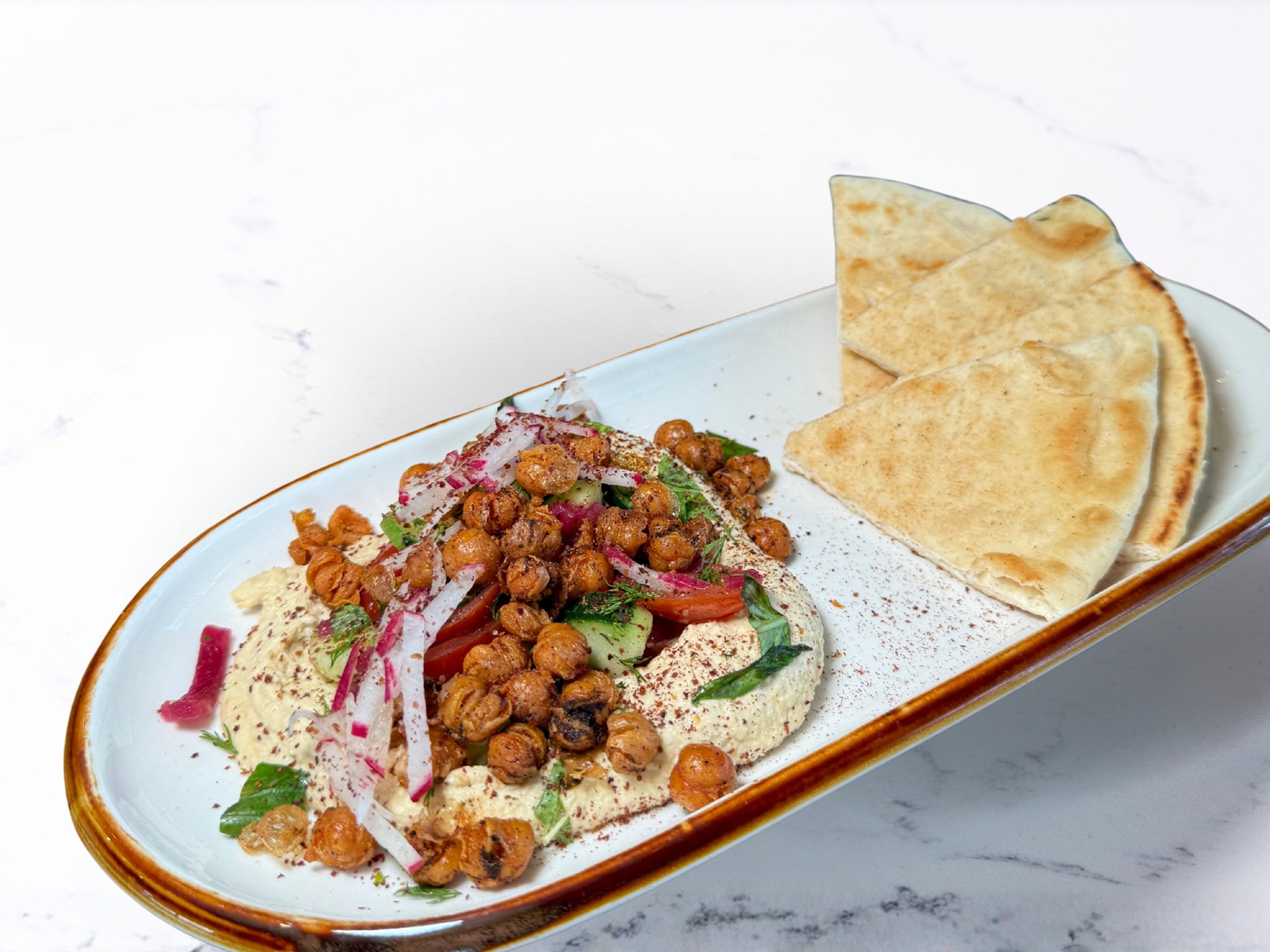 with marinated tomato, cucumber, pickled red onions, crispy chickpeas, olive oil, basil, mint, dill, radish & sumac