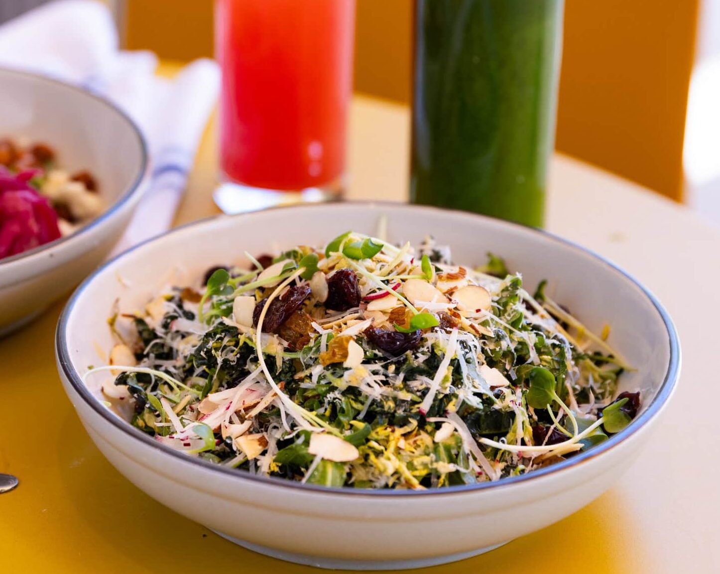 [NEW, gf, v] shredded kale, shaved brussels sprouts, citrus quinoa, arugula, parmesan, dried cherries, golden raisins, shaved almonds, radish, sweet honey vinaigrette