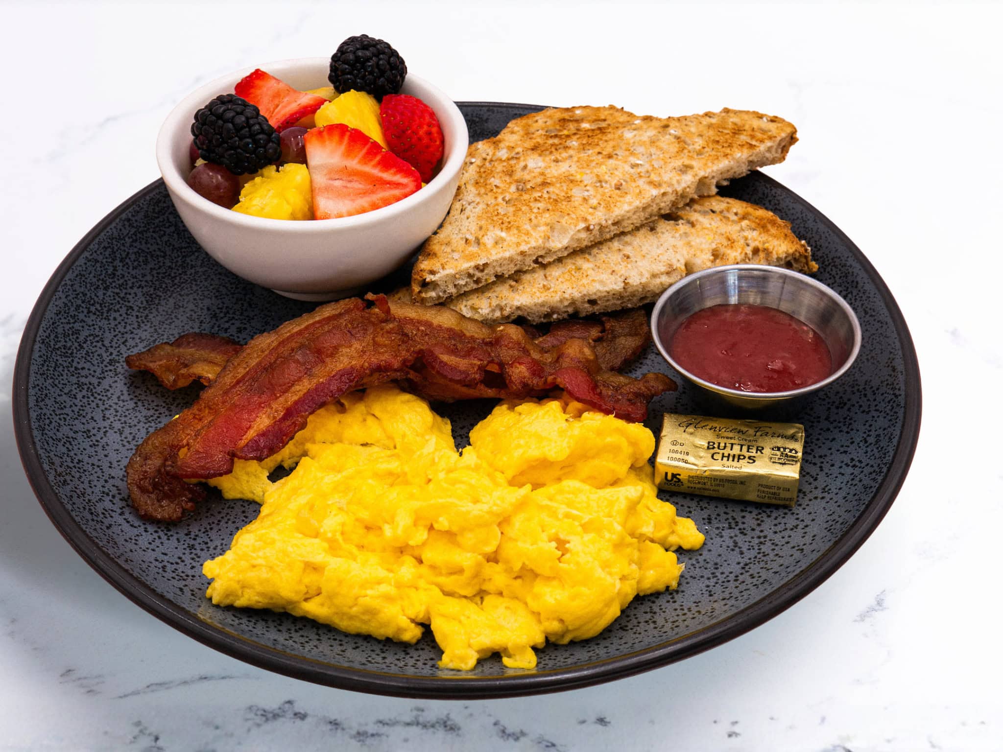 two vital farms eggs*, bacon, multigrain toast, seasonal fruit [sub grits +1]